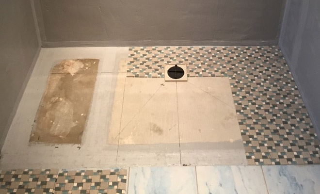 Once the floor has been waterproofed, a qualified tiler will then install your flooring, making sure that they cut along the lines of the shower base and install the tiles on the measured slope.